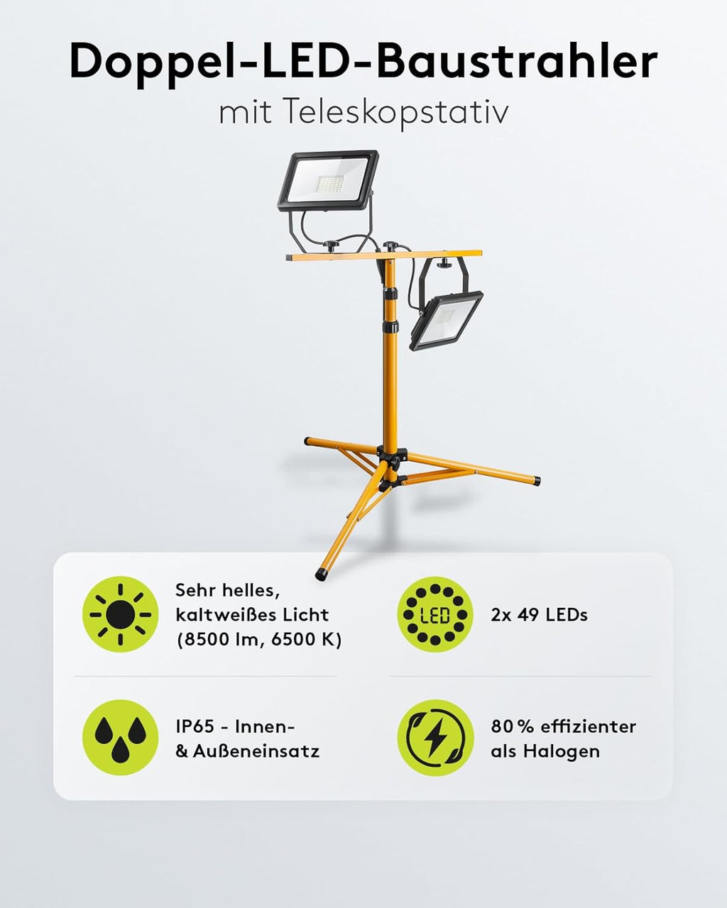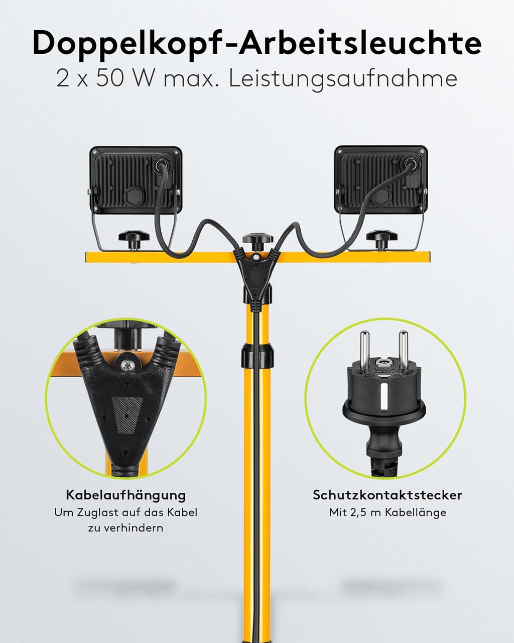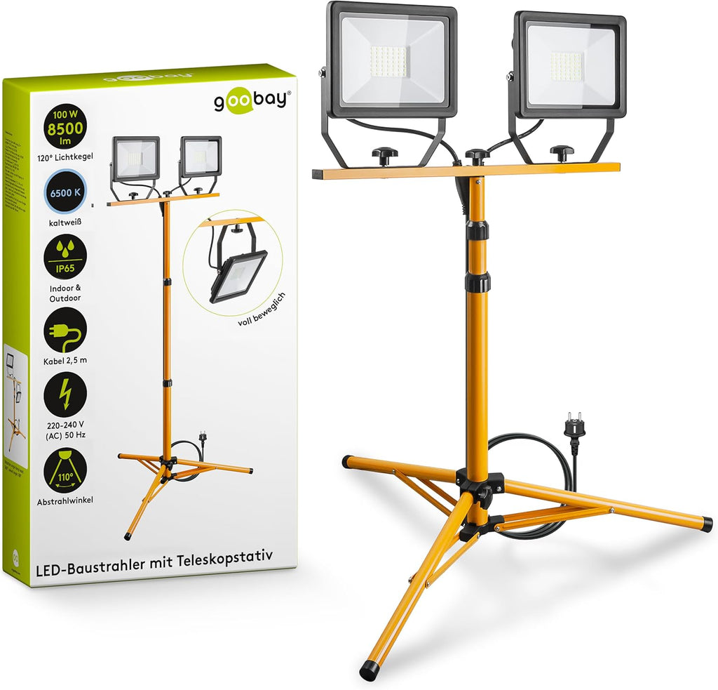 2 x 50W Baustrahler LED mit Stativ einstellbar und 2,5m Kabel für Baustelle, Werkstatt oder Keller - IP65 Baulampe LED für Innen- & Außenbereich - Strahler 2x8500 Lumen kaltweißes Licht 6500K [Energieklasse F]