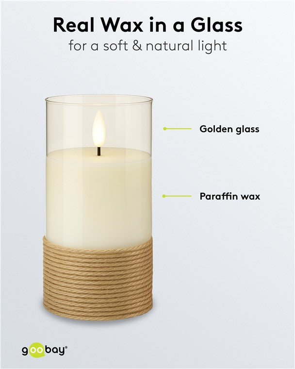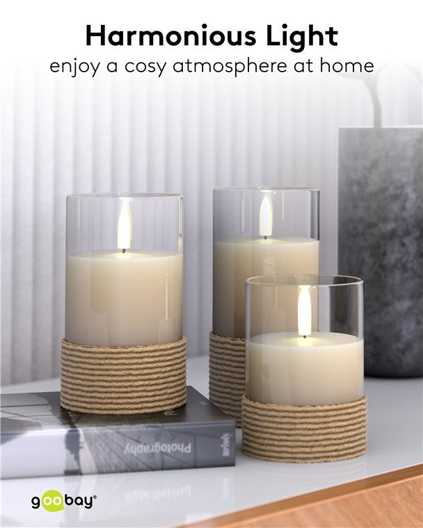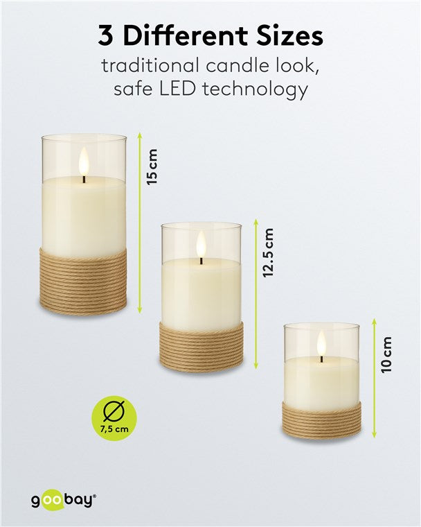 • Stilvolle Stumpenkerzen in drei verschiedenen Größen mit natürlich wirkender, flackernder Flamme im transparenten Glas, mit Hanf umwickelt – vollkommen elektrisch und vollkommen sicher