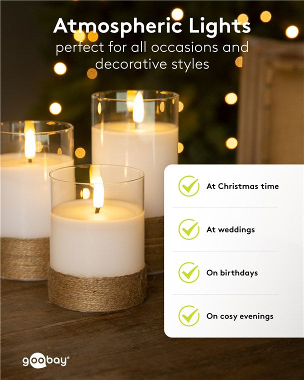 • Maße (H x Ø): 10 x 7,5 cm, 12,5 x 7,5 cm, 15 x 7,5 cm, jede LED-Kerze betrieben mit 3x AAA-Batterien (nicht im Lieferumfang enthalten)