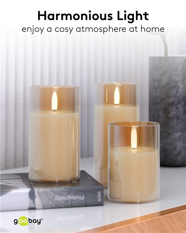 • Stilvolle Stumpenkerzen in drei verschiedenen Größen für warmen Kerzenschein mit natürlich wirkender, flackernder Flamme in einem goldenen Glas – vollkommen elektrisch und vollkommen sicher