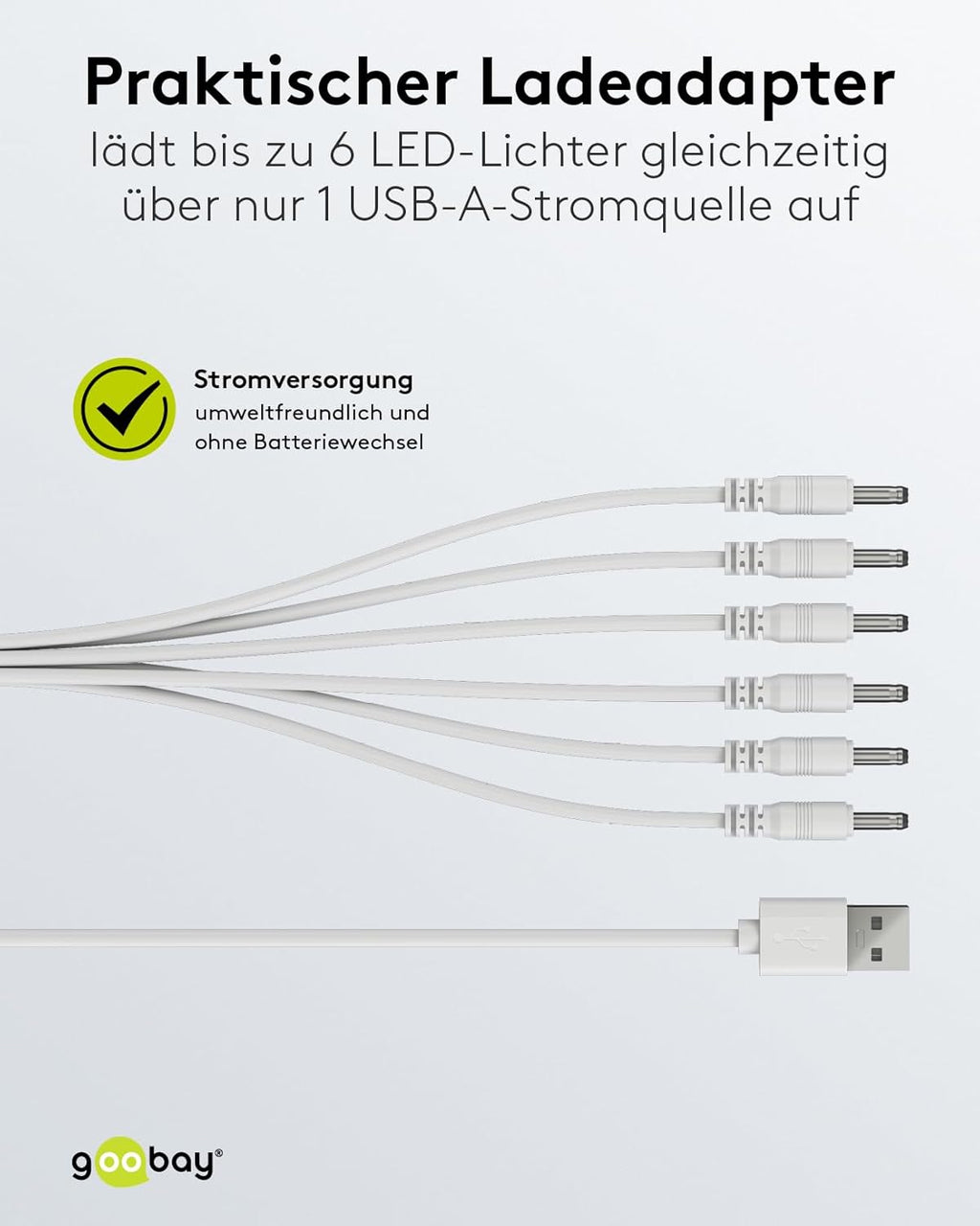 • Der praktische Ladeadapter lädt bis zu sechs LED-Lichter gleichzeitig über nur eine USB-A-Stromquelle auf (5-V-USB-Ladekabel enthalten, 1 m Länge)