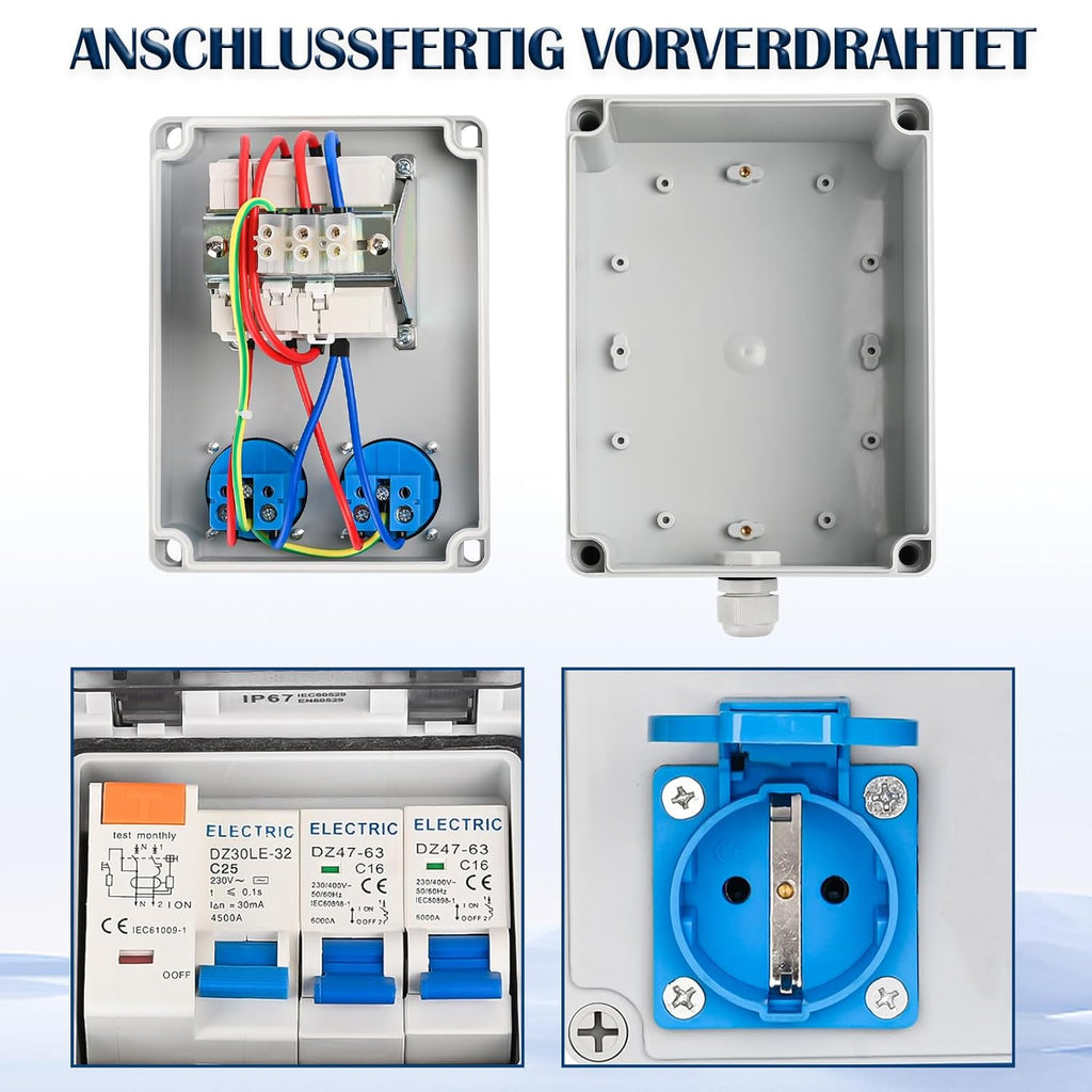 - 2x Schuko-Steckdose 230V 16A + 2x 1P Leitungsschutzschalter C16A + 1x 2P Fehlerstromschutzschalter 25A bieten zuverlässigen Strom und gewährleistung der Schaltungssicherheit.