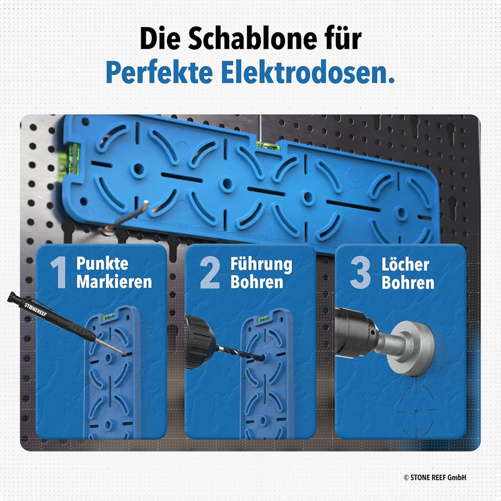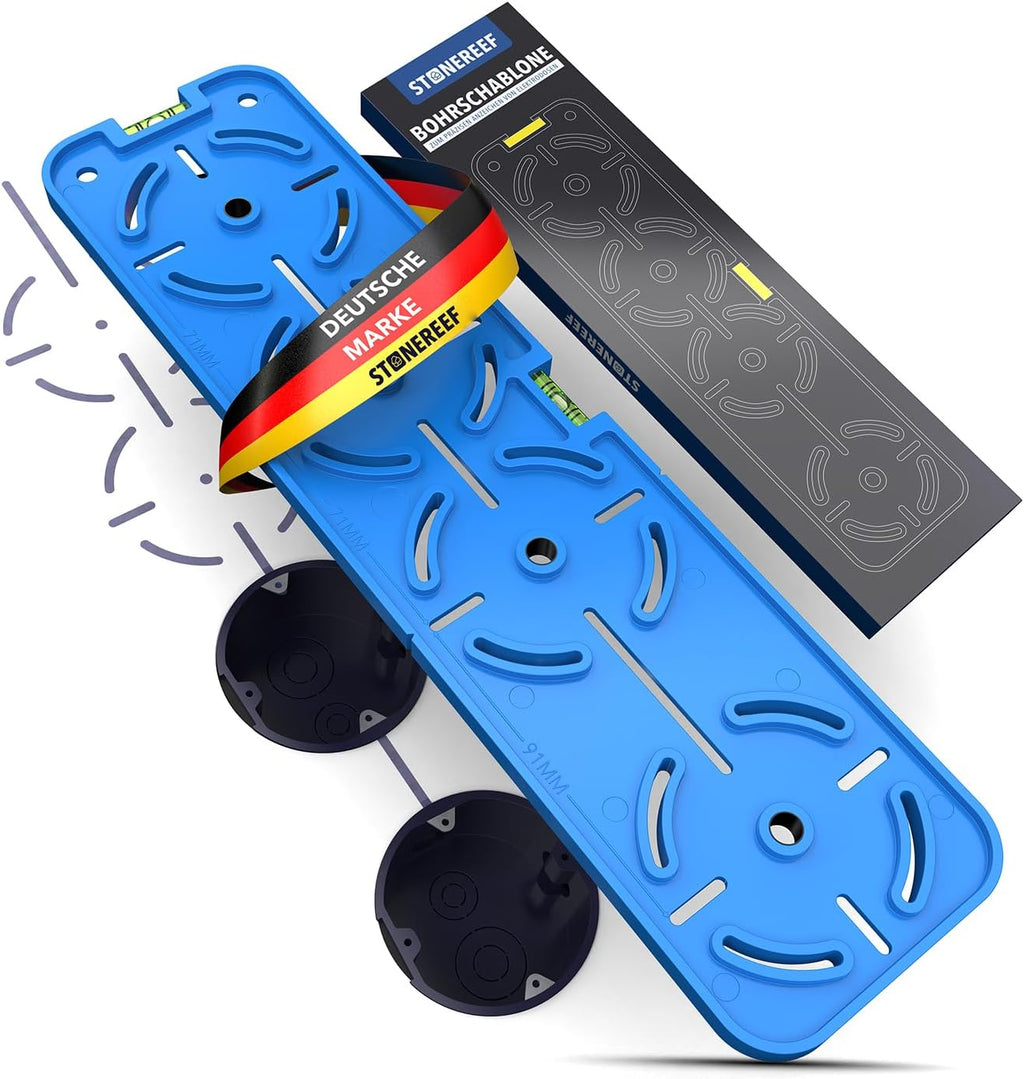 Bohrschablone Steckdose 68mm mit Wasserwaage – Bohrhilfe für Unterputzdose & Hohlwanddose – Blau/Grün – Schablone für Elektriker im Trockenbau – Steckdosen exakt ausrichten & bohren (Bohrschablone)