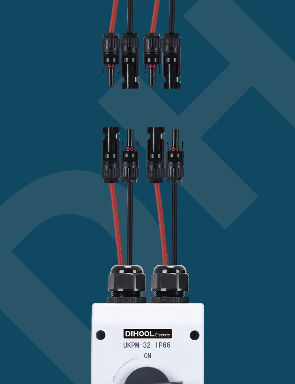 • Erfüllt die EN 60947-3 Norm, geeignet für Photovoltaikanlagen mit bis zu 2 Strings (≤600V). Jeder String kann einen Strom von 32A führen.