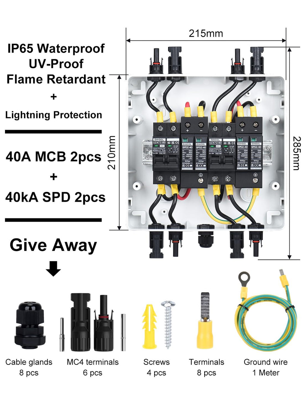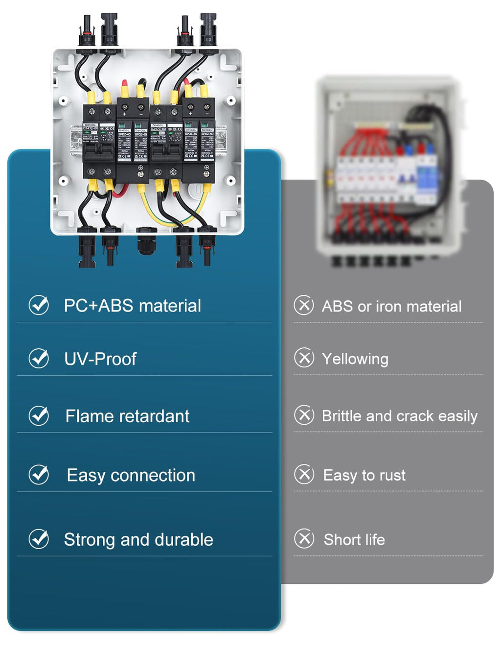 - Überspannungsschutz:20-40kA 2P DC1000V,Verwenden Sie Standard Blitzschutz-Chip anstelle von Piezoresistor;Leistungsschalter:40A DC1000V 2-pilog,Silberkontakt,Flammhemmende Schale,Ausreichend Kupferspule; Gehäuse: IP65,PC Material PC-Materialien haben eine ausgezeichnete Korrosionsbeständigkeit und eignen sich besser für die Herstellung von Komponenten, die in rauen Umgebungen arbeiten als Eisen