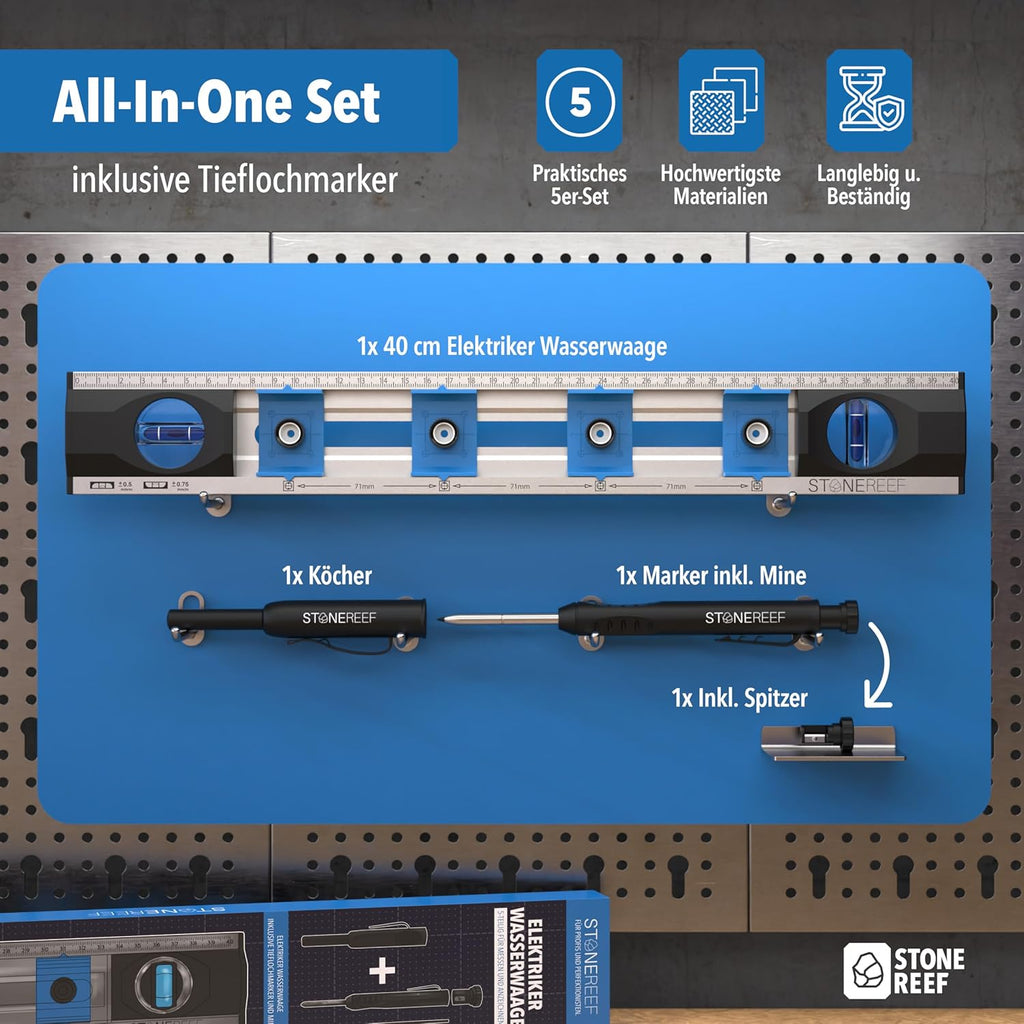 • ✅ INKLUSIVE TIEFLOCHMARKER - Tieflochmarker mit einer Mine ist Lieferumfang enthalten, um das Markieren der Bohrlöcher zu erleichtern und die Genauigkeit Ihrer Arbeiten zu verbessern.