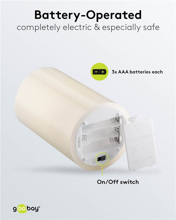 • Maße (H x B): 10 x 7,5 cm, 12,5 x 7,5 cm, 15 x 7,5 cm, jede LED-Kerze betrieben mit je 3x AAA-Batterien (nicht im Lieferumfang enthalten)