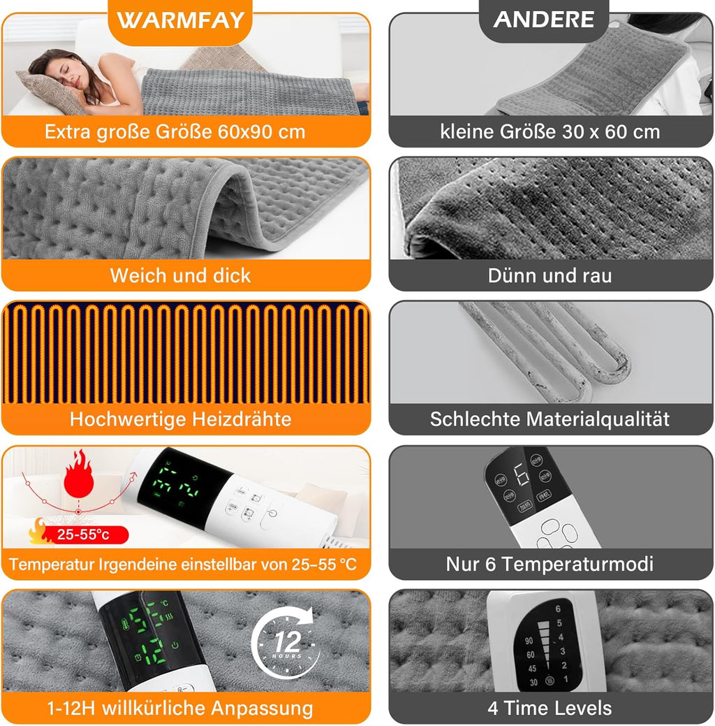 • Die Warmfay Heizdecke mit einstellbaren 30 Temperatureinstellungen (25°C-55°C) und einem 12 Timer (1-12h) können Sie die gewünschte Temperatur nach Ihren Vorlieben einstellen. Ermöglicht die Einstellung der gewünschten Temperatur und Zeit für eine individuelle Wärmetherapie.