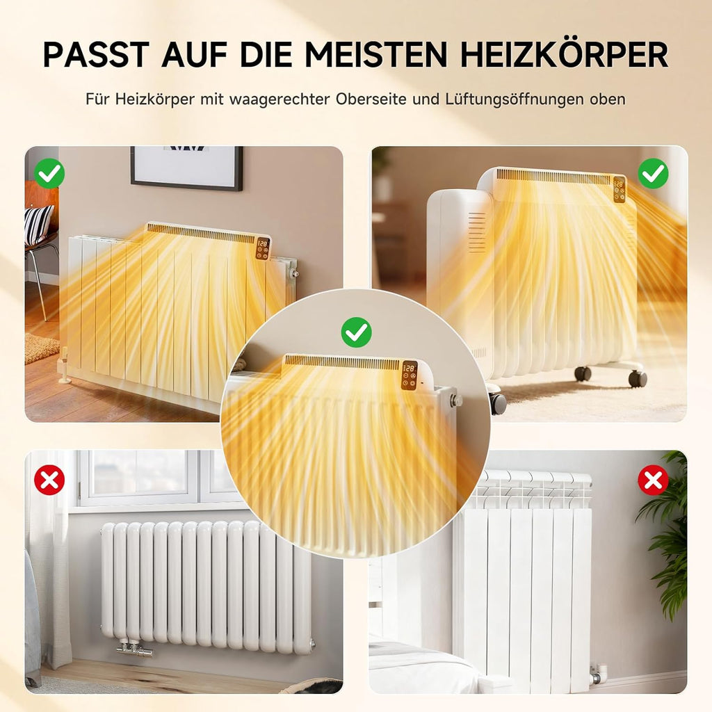 • Ohne Komplizierte Montage! Der Heizungsventilator verfügt über leistungsstarke Magnete an der Unterseite, sodass er an fast jedem Heizkörper mit flacher Oberseite und Standard-Lüftungsöffnungen fest angebracht werden kann. Befestigen Sie den Heizungslüfter einfach am Heizkörper und schalten Sie ihn ein.