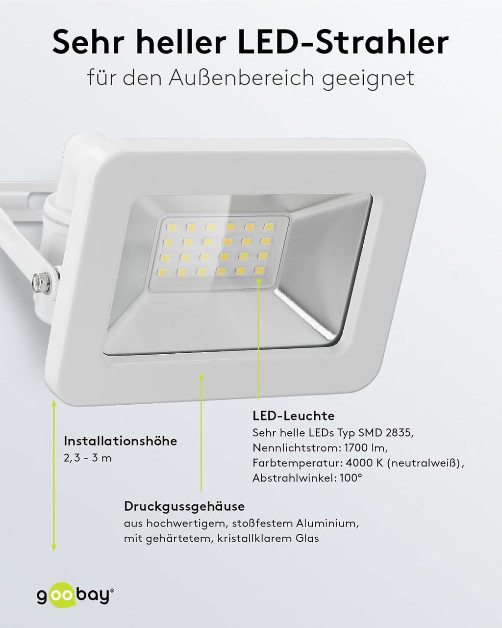 • LED-Außenbeleuchtung mit großem 100°-Abstrahlwinkel ist ideal als Gartenstrahler oder zur Beleuchtung von Fassaden geeignet.