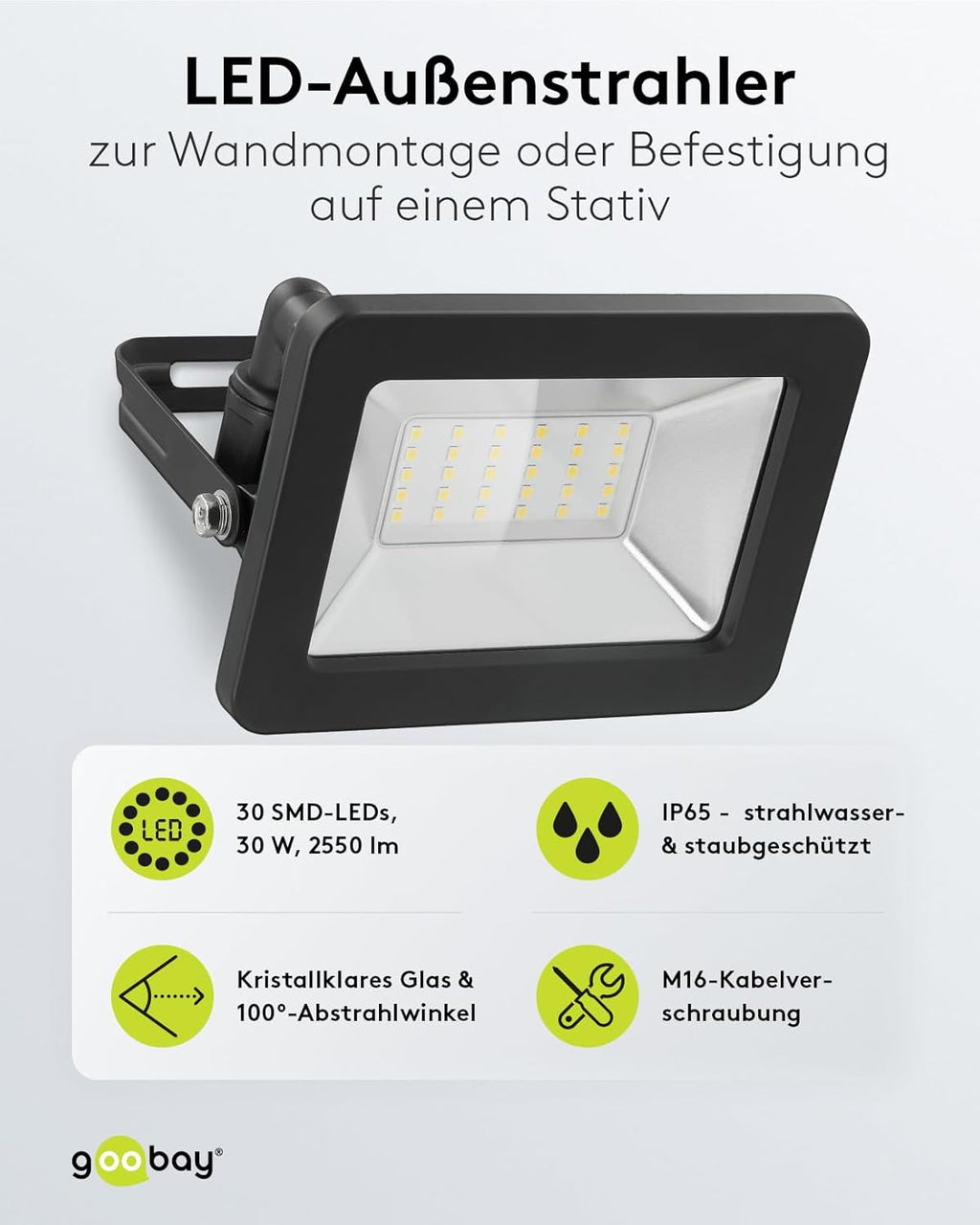 LED Strahler Außen 30W / Außenstrahler IP65 / Neutralweißes Licht 2550 lm/LED Scheinwerfer Fluter Wandmontage / IP65 Gartenstrahler/Schwarz [Energieklasse F]