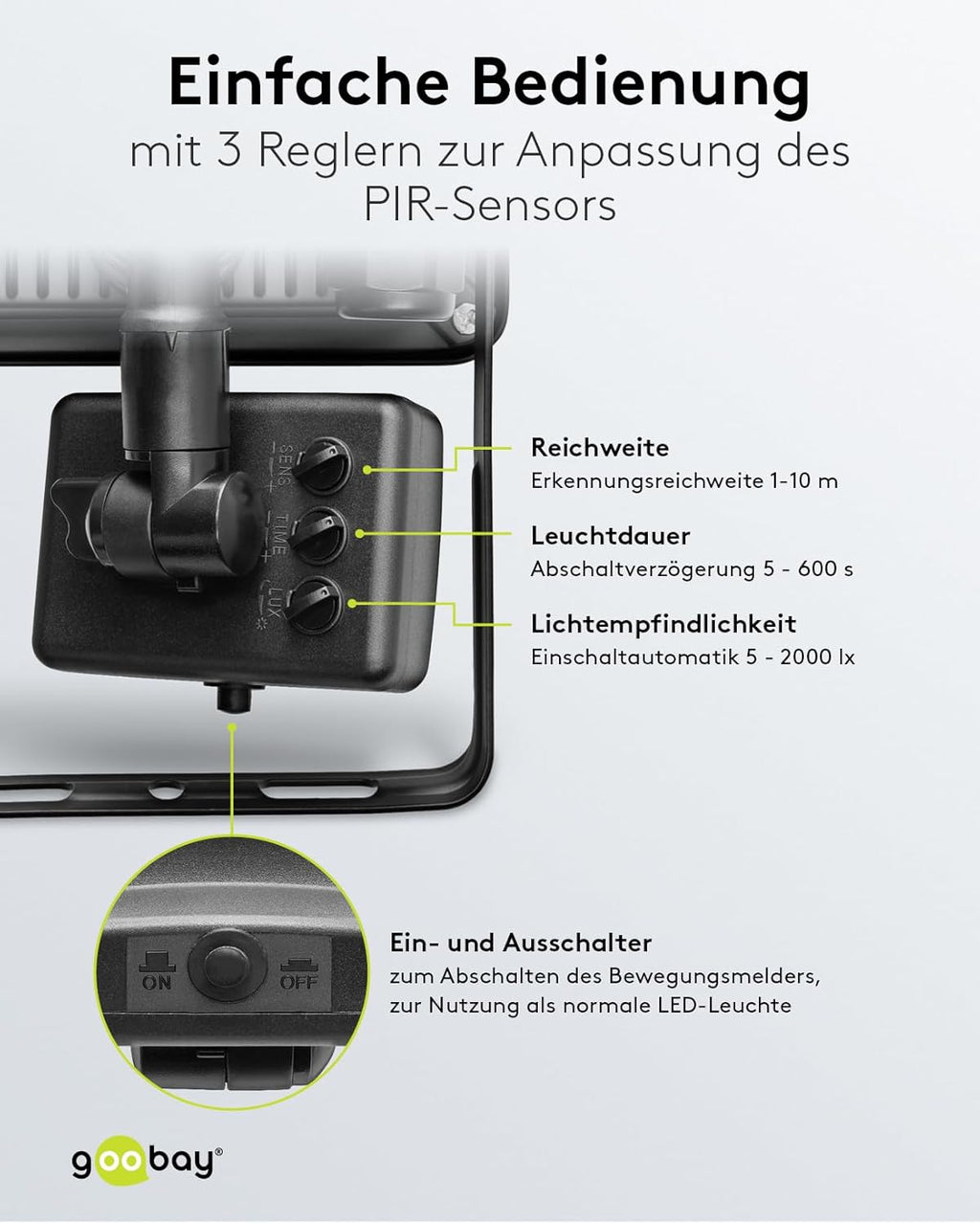 • Erfassungsbereich PIR-Bewegungsmelder: max. 10 m im 180°-Winkel, einstellbare Ausschaltverzögerung (5-600 s), Lichtempfindlichkeit (5-2000 lx) und Reichweite (1-10 m)