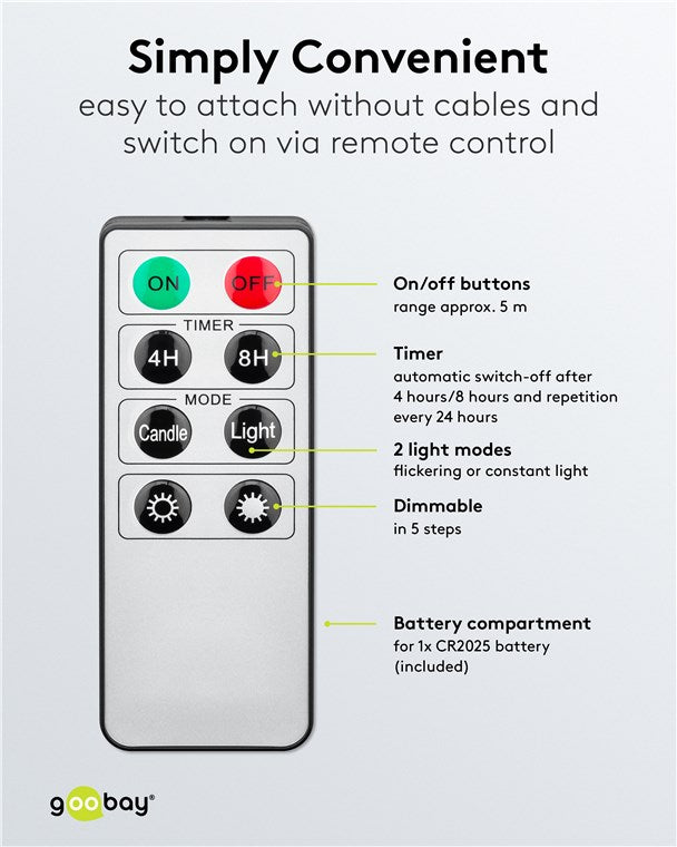 • Fernbedienung mit On-/Off-Schalter und Timerfunktion für Leuchtintervalle (4 h, 8 h, Wiederholung im 24-Stunden-Takt), Reichweite ca. 5 m