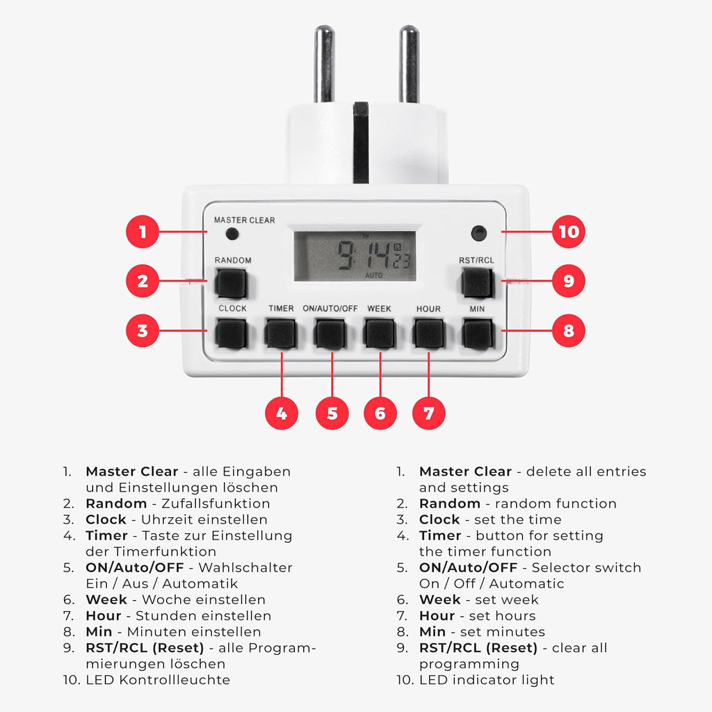 MC Power - Digitale Zeitschaltuhr Steckdose | AZ-53 | 10 Schaltprogramme, 12/24 Std. Zyklus, programmierbar mit Backup-Batterie, energiesparender Timer für Haushalt, Büro