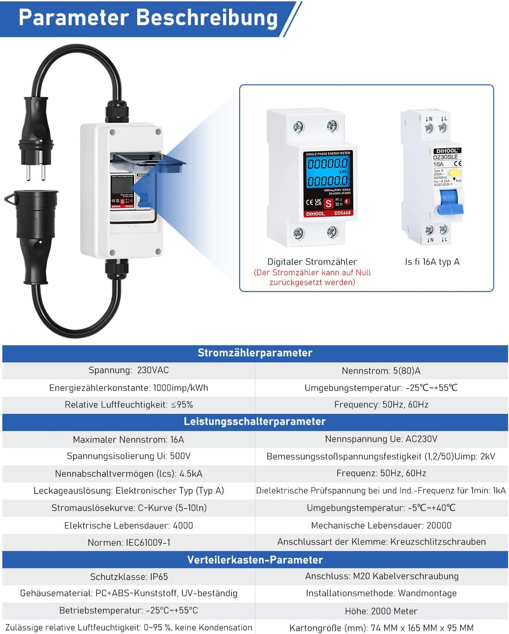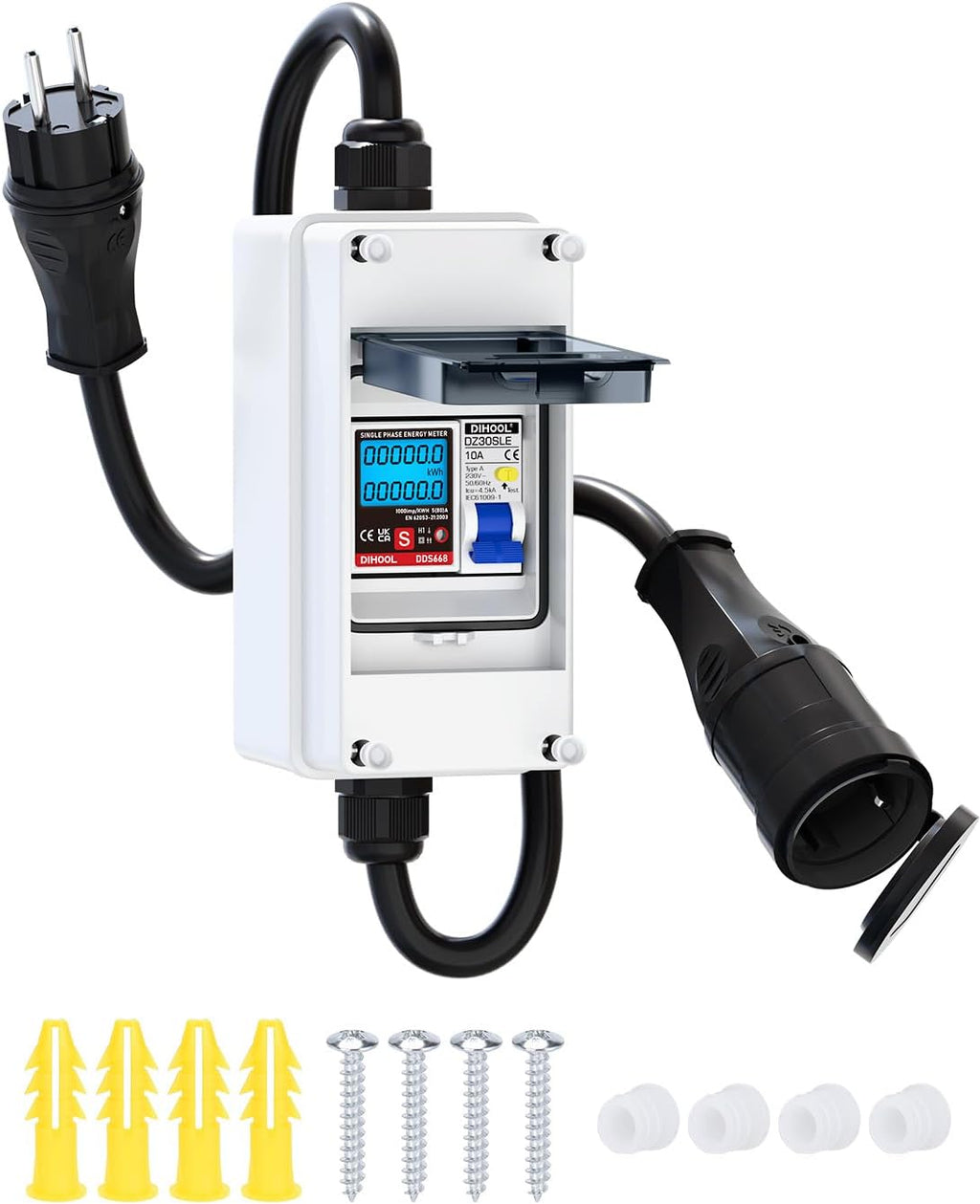 Mobiler Digitaler Stromzähler Für Steckdose 80A 230V Mit Typ A fi ls Schutzschalter 16A und Schuko Stecker Ip65 Stromverbrauchsmesser