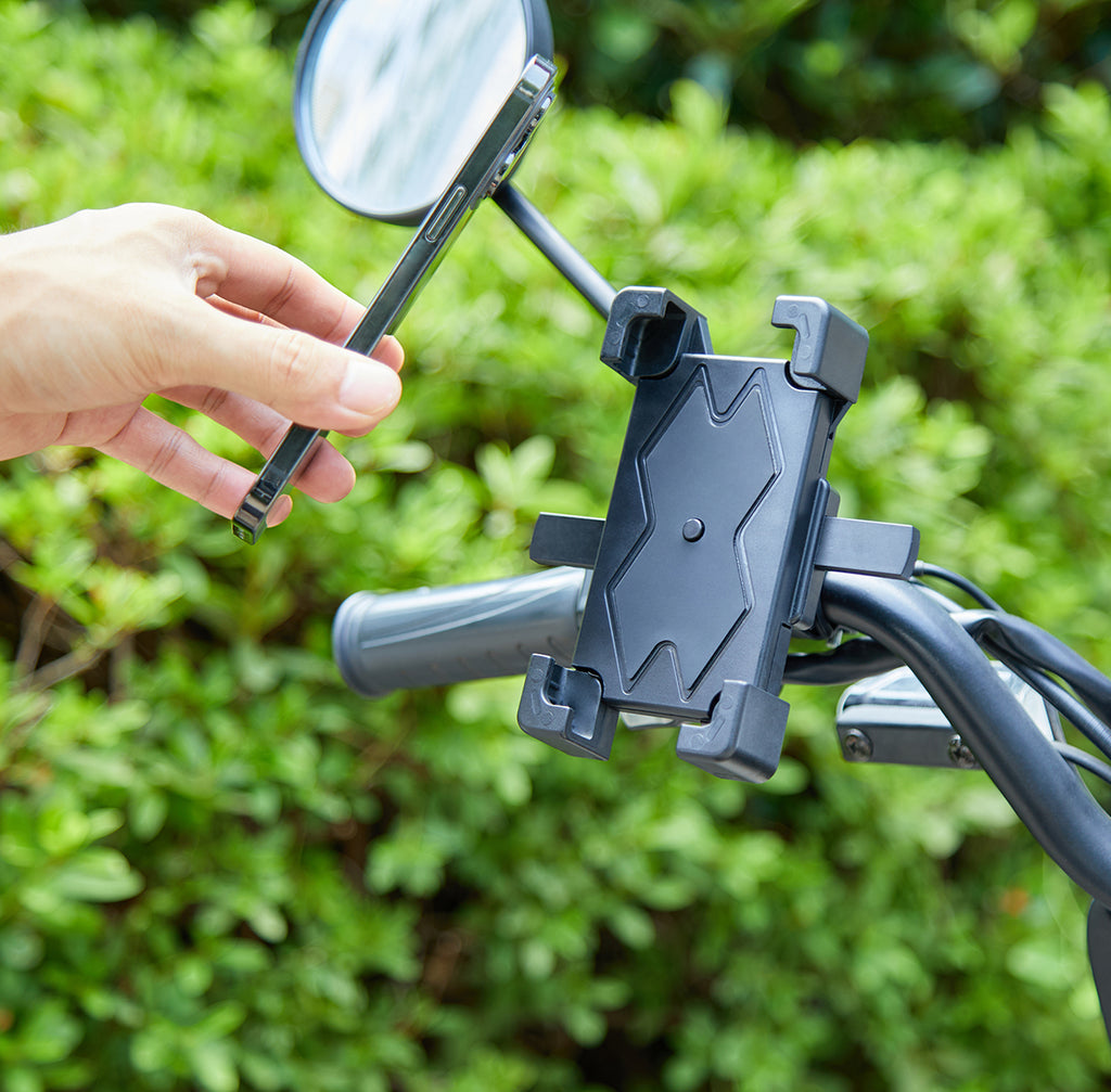 Diese Handyhalterung können Sie an Ihren Fahrradlenker montieren, aber auch an anderen runden Gegenständen wie auch an die Spiegel oder Lenkrad von Ihrem Roller oder Motorrad.
