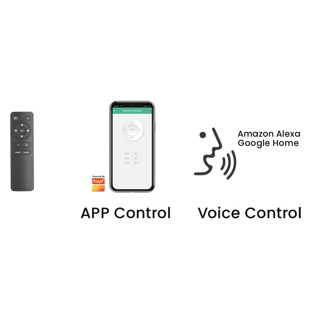 Der Lift für große Fernseher mit Bildschirmdiagonalen von 94-203 cm lässt sich jetzt auch mit Sprachsteuerung bewegen. Eingebaut in Ihren TV Schrank, lässt der Lift Ihren Fernseher nach Wunsch emporfahren oder platzsparend verstauen. Dadurch ist Ihr wertvoller Fernseher stets gut geschützt. Der TV Lift hat eine Hubhöhe von 1050 mm und kann sowohl mit Sprachsteuerung über Alexa und Google Home gesteuert werden, als auch per Tuya App oder Fernbedienung. Der Positionsspeicher gewährleistet, dass der Fernseher präzise auf die vorher festgelegte Sichthöhe eingestellt wird.