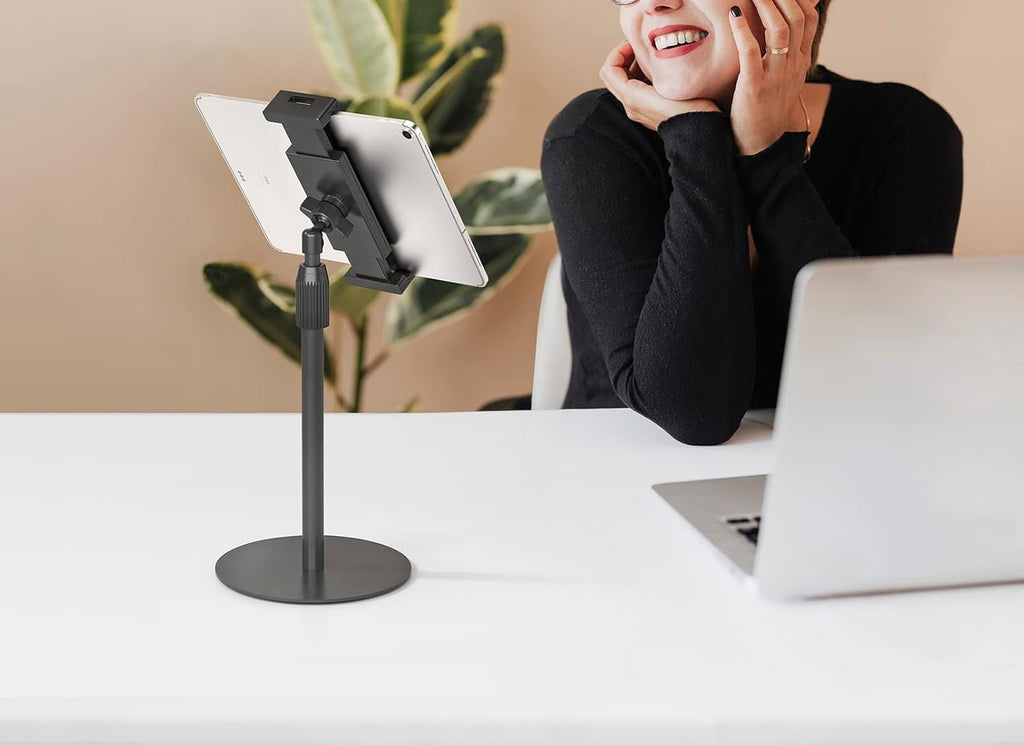 Der höhenverstellbare Tischständer hält Ihr Smartphone oder Tablet für ein freihändiges Handling.