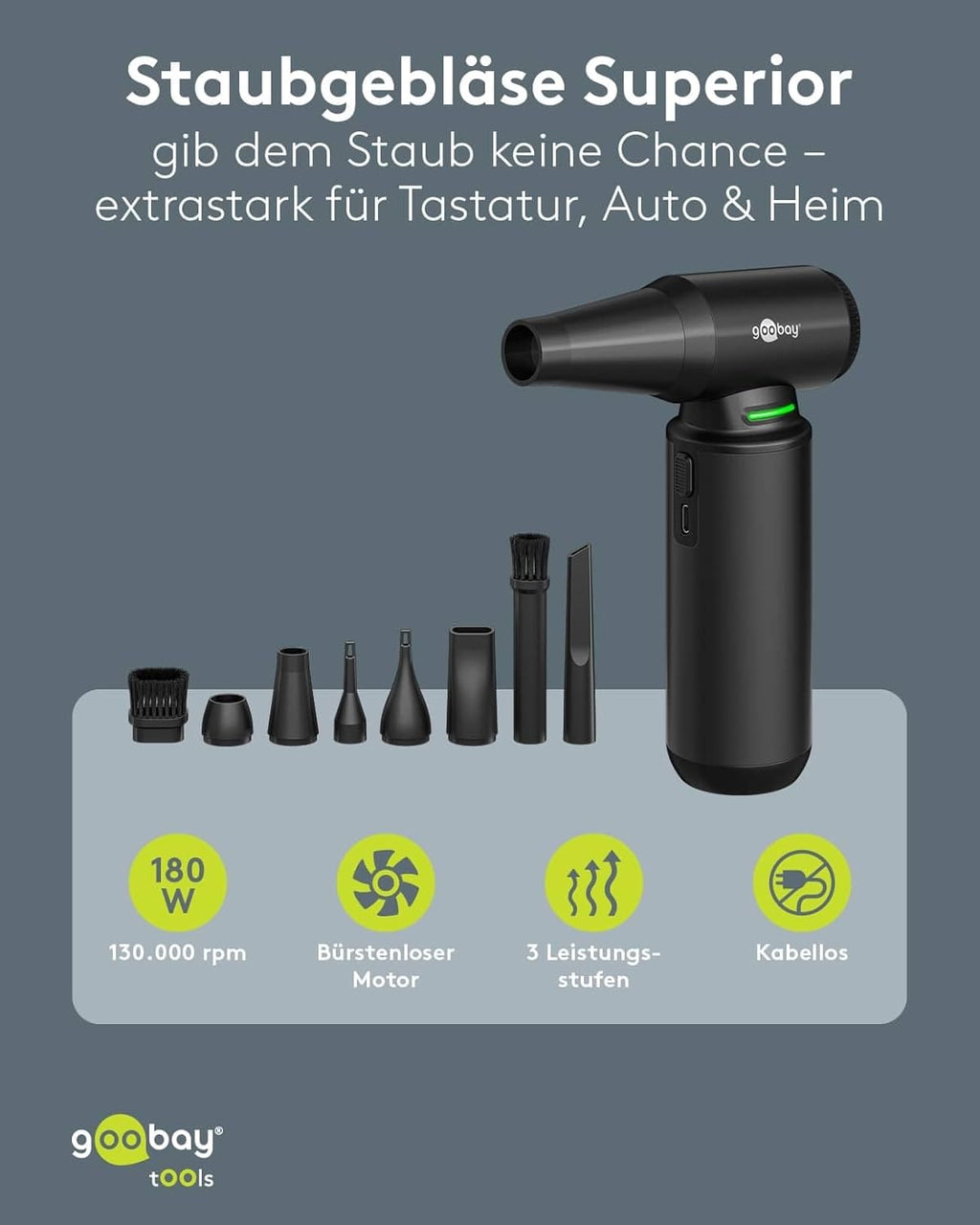 Staubgebläse Superior mit 3 Stufen, 6.000 mAh Akku, 130.000 rpm, bis 110 min Betriebsdauer, inkl. 8 Aufsätze zum Entfernen von Staub auf Tastaturen, im PC, im Sofa, Autointerieur