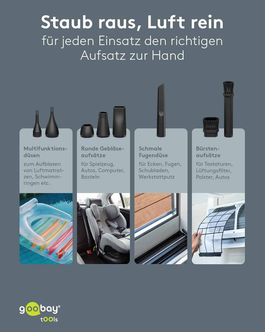 • Variabel einsetzbar: Das Gebläse entfernt Tierhaare, Holzstaub von Arbeitsstellen, Laub von Autos und kann sogar zum Aufblasen von Luftmatratzen oder Poolzubehör verwendet werden