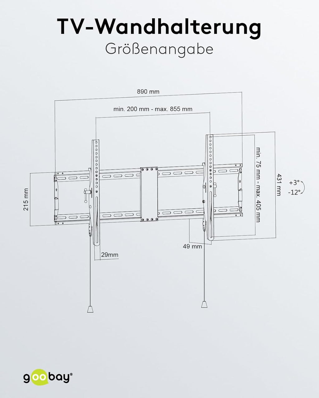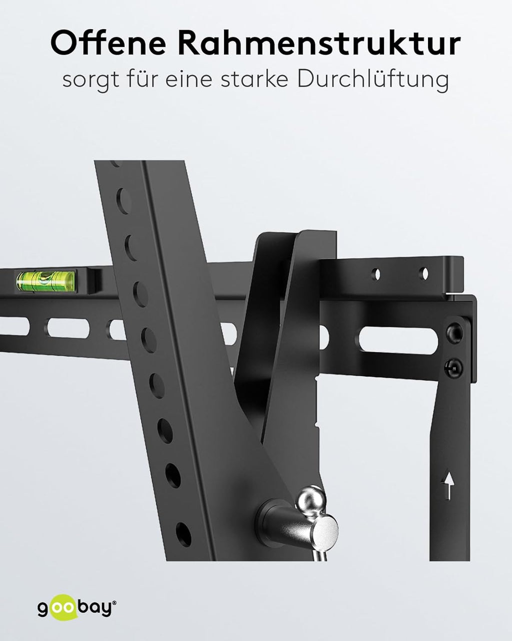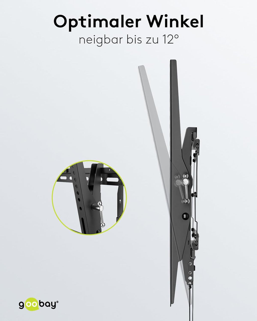 Die neigbare TV-Wandhalterung, die Ihren Fernseher mit einer Größe von 43-100 Zoll (109-254 cm) und einem Gewicht von 70 kg sicher halten kann. Sie kann von 3° bis 12° geneigt werden. Der automatisch einrastende Federverschluss mit leicht zu lösender Schnur sorgt für eine einfache und sichere Befestigung Ihrer Flachbildschirme an der Wand. Durch die seitliche Verschiebung kann der Fernseher auf der Wandplatte nach links und rechts bewegt werden, so dass er genau dort steht, wo Sie ihn haben möchten. Eine neigbare TV-Wandhalterung ist die optimale Montagelösung, wenn Sie eine gewohnte Sitzposition haben und sich der Mittelpunkt bzw. der untere Teil des Flachbildschirms oberhalb der Augenhöhe befinden soll.