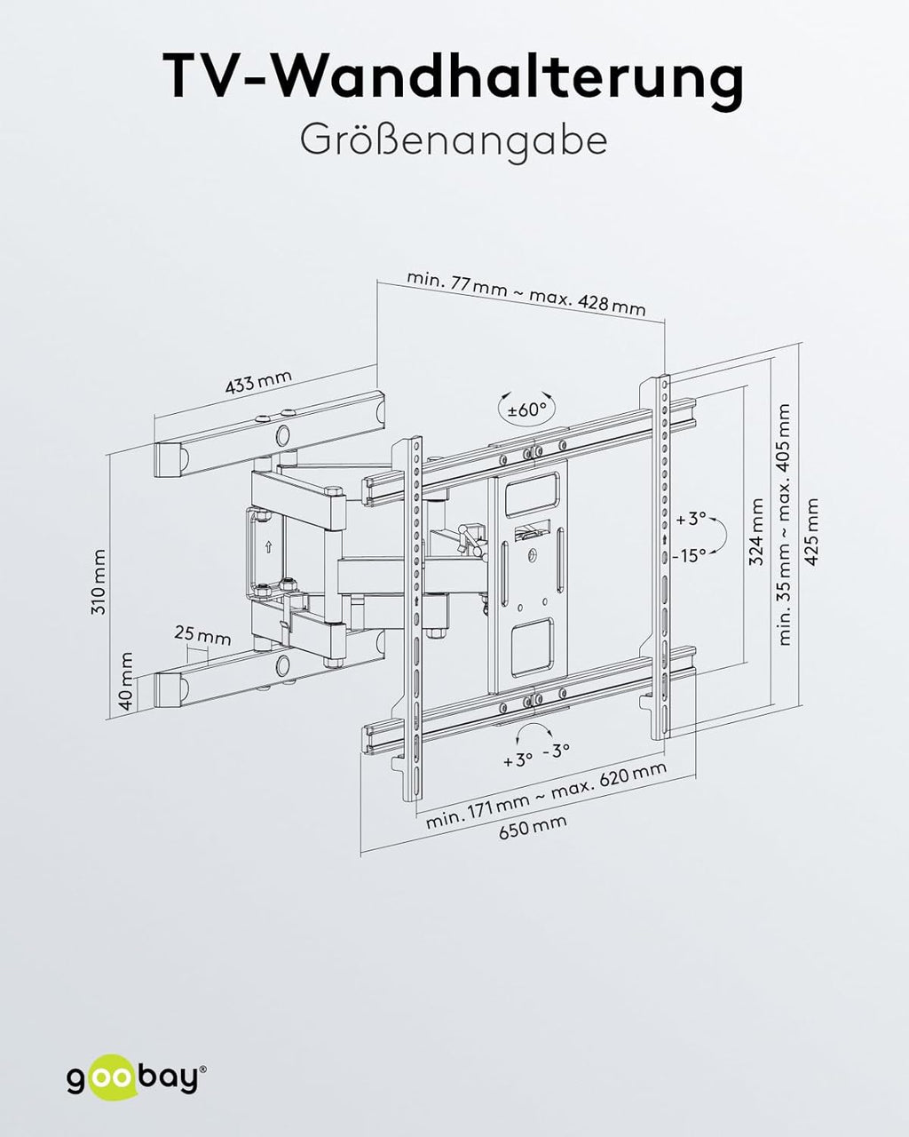 • Der Wandhalter hält den Fernseher in der Ausgangsposition mit nur 77 mm elegant flach und platzsparend an der Wand und kann bis zu 428 mm ausgefahren werden um den optimalen Blickwinkel zu erreichen.