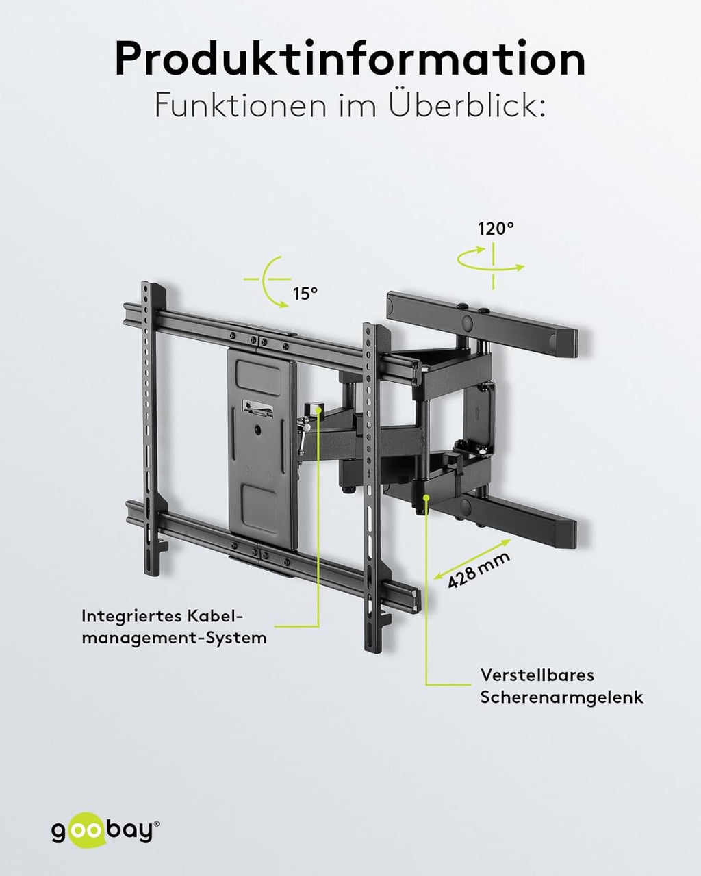 Die Fullmotion-Halterung für die meisten 37-70 Zoll (94-178 cm) Fernseher bis zu 60 kg. Diese Halterung bietet bis zu 428 mm Wandabstand und ermöglicht somit einen optimalen Schwenkwinkel. Fullmotion ermöglicht maximale Flexibilität - Sie können Ihren Fernseher ohne Werkzeug neigen, schwenken, ausfahren und justieren, um ihn von jedem beliebigen Sitzplatz im Raum bequem betrachten zu können. Die Justierung nach der Installation stellt sicher, dass der Fernseher perfekt an der Wand positioniert ist. Das integrierte Kabelmanagementsystem sorgt für Ordnung und Schutz der Kabel.