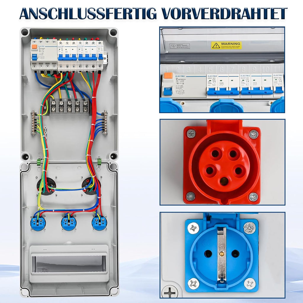 - 3x Schuko-Steckdose 230V 16A + 1x 5P CEE-Steckdose 380V 16A + 1x 5P CEE-Steckdose 400V 32A + 1x 3P Leitungsschutzschalter C32A + 1x 3P Leitungsschutzschalter C16A + 1x 1P Leitungsschutzschalter C16A + 1x 4P Fehlerstromschutzschalter 40A bieten zuverlässigen Strom und gewährleistung der Schaltungssicherheit.